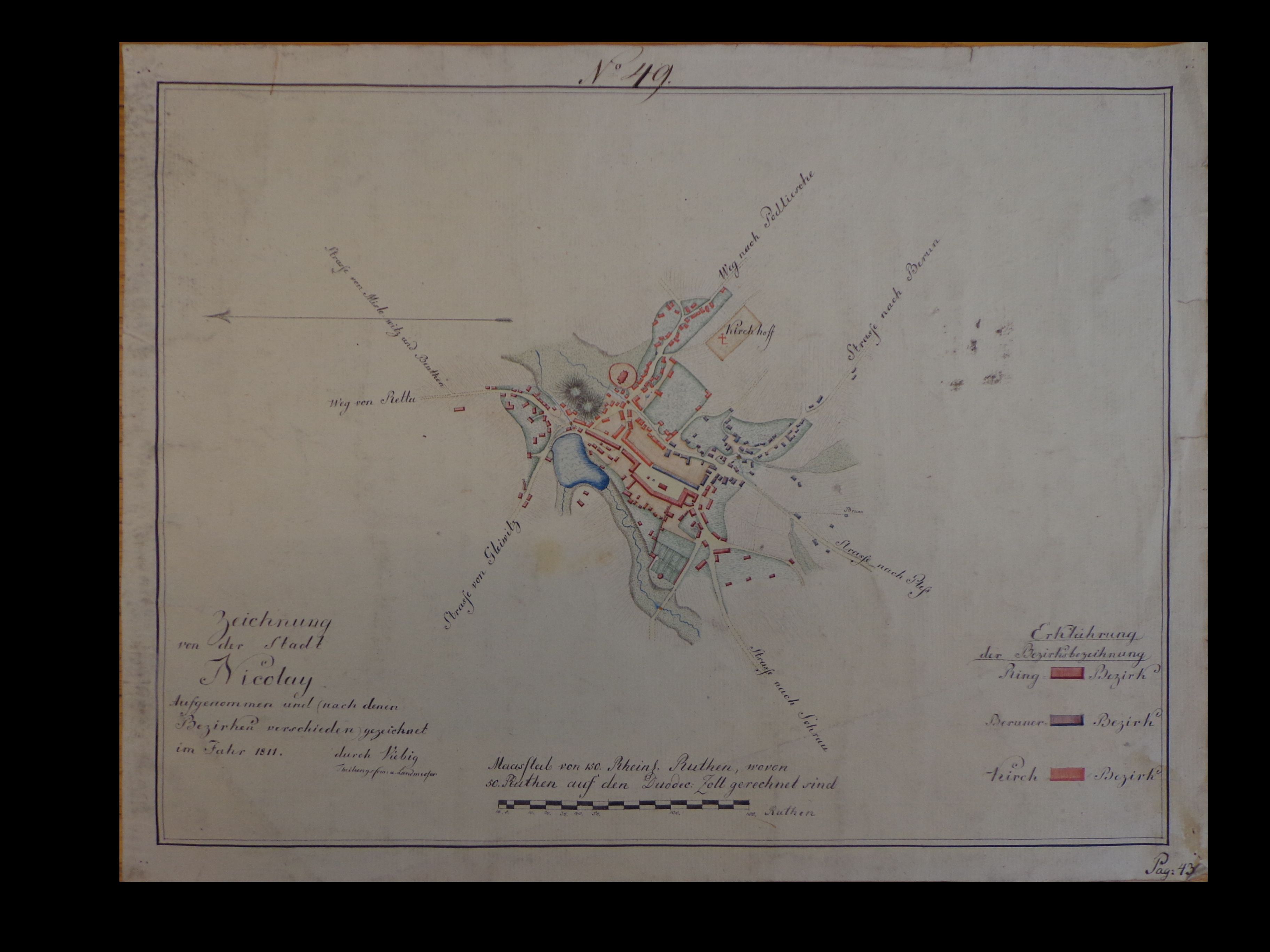Niewątpliwie przełomem w dziejach kartowania miast na Górnym Śląsku była przeprowadzona w latach 1810–1812 akcja skartowania według jednolitej zasady wszystkich miast w pruskiej części regionu. Ich powstanie zostało wymuszone przez rewolucyjne reformy ustroju municypalnego na Śląsku zadekretowane przez nową pruską ordynację miejską (Städtordnung) podpisaną 19 listopada 1808 roku przez króla Fryderyka Wilhelma III, która wprowadzała jednolity w skali całego państwa ustrój miejski, znosząc podział na miasta wolne (królewskie) i prywatne. Miasto jako gmina miejska stało się podmiotem prawa publicznego, którą tworzył ogół jego obywateli. Ustawa znosiła podział na właściwe miasto i jego przedmieścia, co umożliwiło niekrępowany rozwój urbanistyczny substancji miejskiej. Na podstawie wspomnianej ustawy Ministerstwo Spraw Wewnętrznych (Ministerium des Innern) zarządziło dekretem z 21 czerwca 1810 roku sporządzenie jednolitych planów wszystkich miast, kosztami tej operacji obciążając władze miejskie. Dekret nakazywał sporządzenie planów przez przysięgłych mierniczych, którzy mieli za zadanie wykonanie dwóch rodzajów map. Pierwszy, podstawowy w skali 1:7200, przedstawiał samo miasto z jego zabudową oraz z zaznaczeniem ważniejszych budynków publicznych, ulic, mostów, rzek, podmiejskich ogrodów, pól i łąk, ewentualnie też wodociągów, murów i bram miejskich. Drugi o dwukrotnie pomniejszonej skali, a więc 1:14 400, miał mieć charakter sytuacyjny miasta z okolicą. Stąd rozplanowanie miast jest na nich często zaznaczone schematycznie lub w dużym stopniu zgeneralizowane. Ukazuje za to sąsiadujące z miastem wsie i ich zabudowę oraz lokalizację okołomiejskich obiektów przemysłowych, a także prowadzące do miasta trakty i inne drogi. Zachowały się plany następujących miast: Baborów, Biała, Bytom, Gliwice, Głogówek, Głubczyce, Gorzów, Hulczyn, Kietrz, Koźle, Krapkowice, Leśnica, Lubliniec, Mikołów, Niemodlin, Olesno, Opole, Prudnik, Pszczyna, Pyskowice, Racibórz, Rybnik, Skorogoszcz, Tarnowskie Góry, Toszek, Ujazd, Wodzisław i Żory. Dla 18 miast zachował się komplet obu rodzajów map o pomniejszeniach 1:7 200 i 1:14 400, dla 6 miast wyłącznie pomniejszenie 1:7 200 (Hulczyn, Leśnica, Prudnik, Pszczyna, Pyskowice i Skorogoszcz), a 2 miasta mają po trzy plany o różnych pomniejszeniach: Olesno – 1:2 880, 1:7 200, 1:14 400 i Racibórz – 1:1 440, 1:7 200, 1:14 400. Pozostały w rękopisach i przechowywane są w zbiorach kartograficznych Archiwum Państwowego w Opolu[9]. Warto zwrócić uwagę, że na mapach w skali 1:7 200 oznaczono okręgi wyborcze do rad miejskich z podziałem na grupy wyborców według cenzusu majątkowego, wprowadzonego ordynacją miejską z 1808 roku, czego większość badaczy do tej pory nie dostrzegało[10].