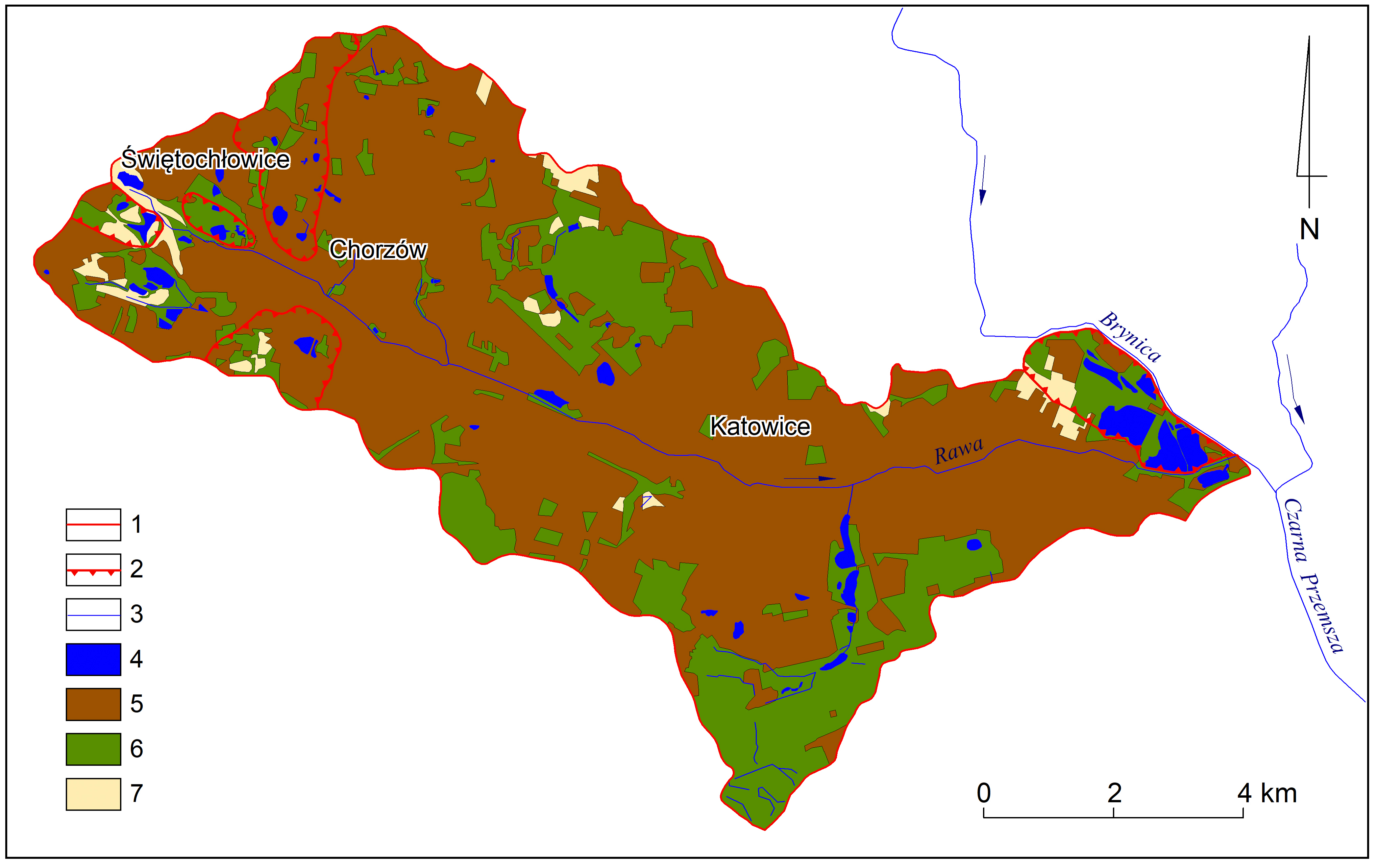 W użytkowaniu zlewni Rawy widoczne są bardzo duże dysproporcje (rys. 1). Dominują tereny zurbanizowane, które zajmują nieco ponad 61 km2 powierzchni, co stanowi udział rzędu 70%. Obszary te reprezentowane są przez zamieszkałe i uprzemysłowione dzielnice miast, przez które przepływa rzeka, a także niewielkie fragmenty południowych części Bytomia i Siemianowic Śląskich.