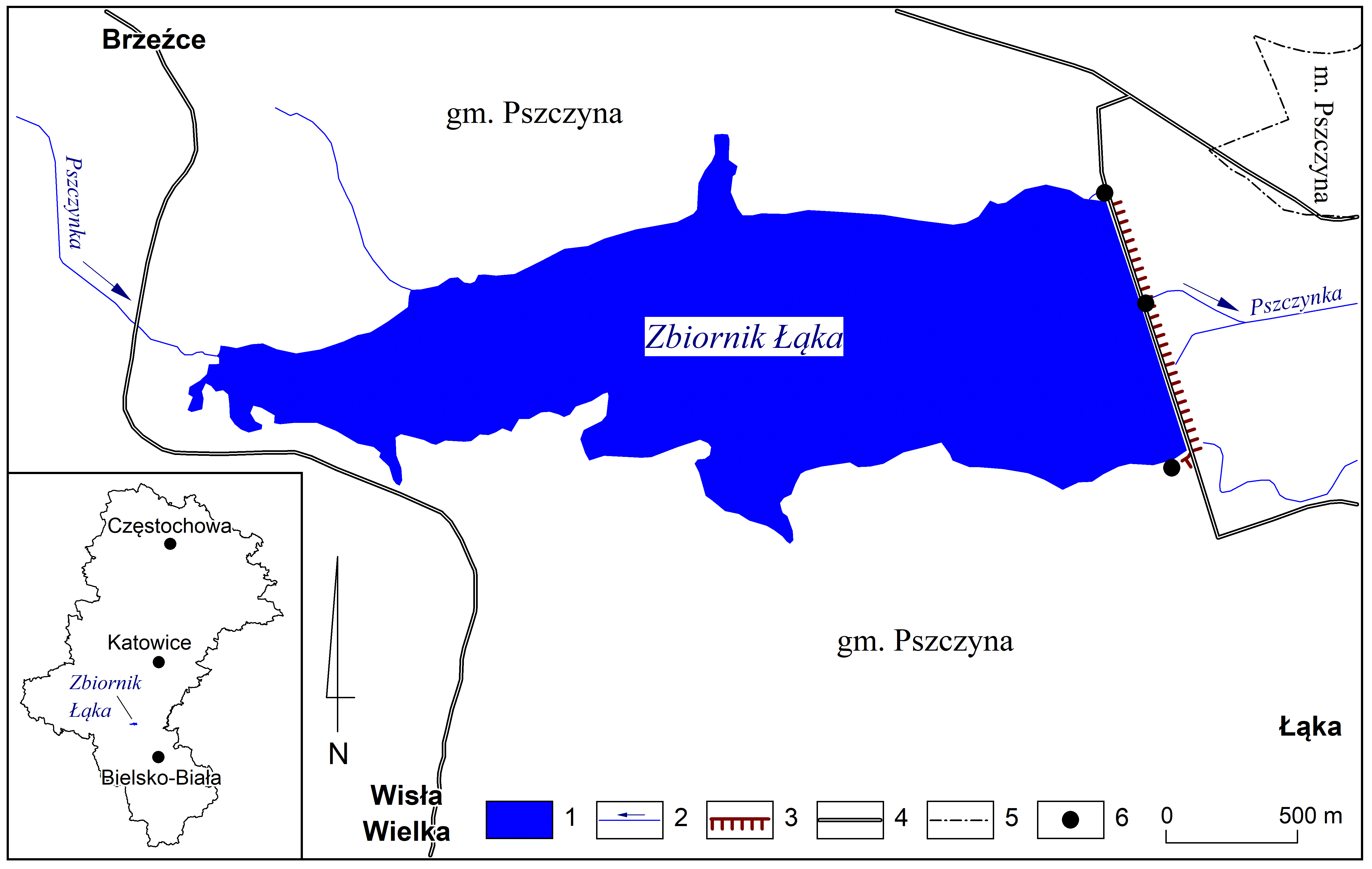 Rys. 1. Lokalizacja zbiornika Łąka: 1 – zbiorniki wodne, 2 – cieki powierzchniowe, 3 – zapory czołowe, 4 – ważniejsze drogi, 5 – granice jednostek administracyjnych, 6 – ważniejsze urządzenia hydrotechniczne.